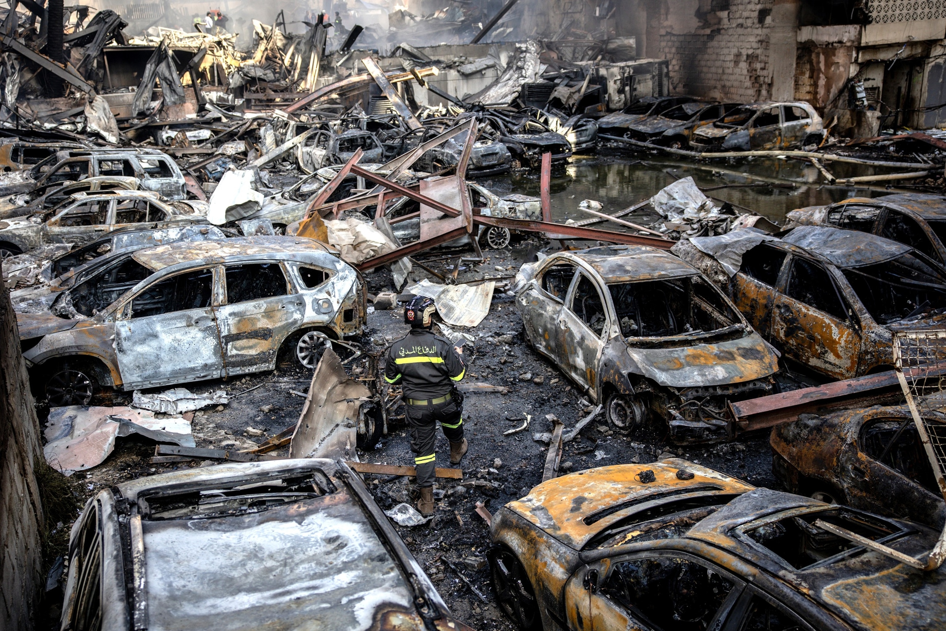 A firefighter walks through destroyed cars as a building burns after an Israeli airstrike, April 8, 2026 in Beirut, Lebanon.